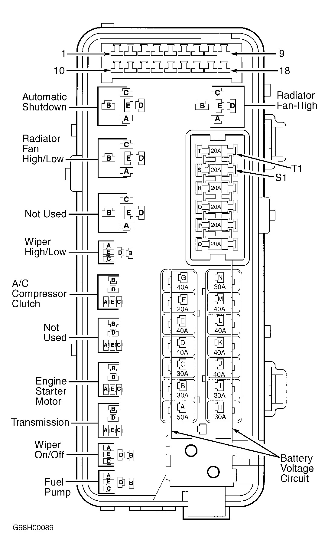 - Remove starter relay in Power Distribution Center (PDC). See Fig 2 . Measure voltage at terminal No. 8 (Yellow wire) at TCM harness connector while turning ignition switch to start position. If battery voltage exists, go to next step. If battery voltage does not exist, repair power distribution circuit as necessary. See POWER DISTRIBUTION article in WIRING DIAGRAMS.