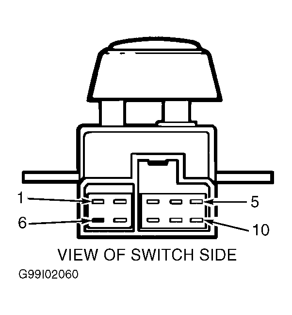 Remove power seat switch from mounting position. See POWER SEAT SWITCH under REMOVAL & INSTALLATION. Using a DVOM, check continuity between specified power seat switch terminals (component side). See POWER SEAT SWITCH CONTINUITY TEST table. See Fig 1 . If continuity does not exist between specified terminals as specified, replace power seat switch.