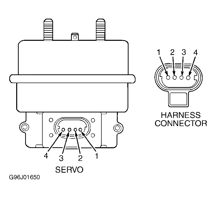 - Turn ignition off. Disconnect Speed Control (S/C) servo connector. Turn ignition on. Press S/C ON/OFF button to turn S/C system on. Connect a jumper wire between servo connector (harness side) terminal No. 3 (Dark Blue/Red wire) and servo terminal No. 3. Connect jumper wires between ground and servo (component side) terminals No. 2 and 4. See Fig 1. Go to next step.