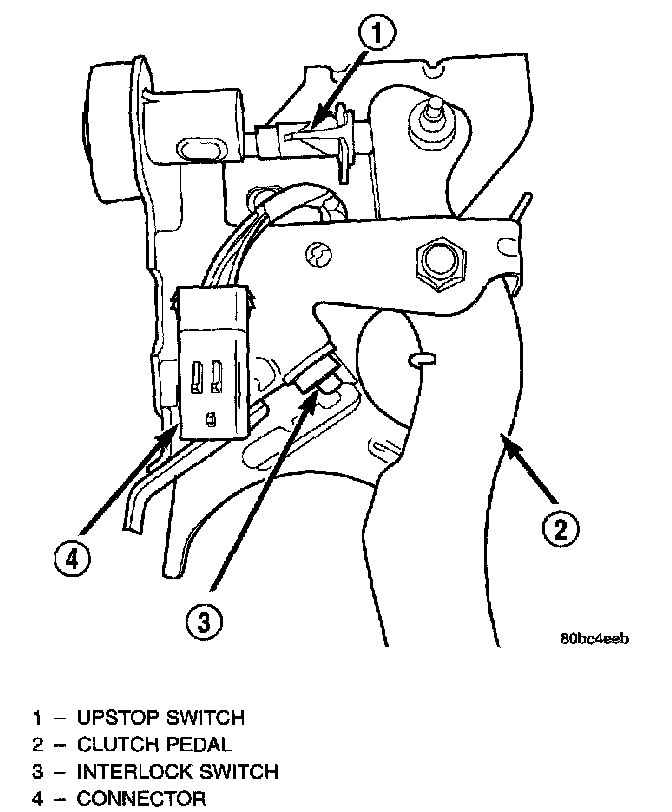 The clutch interlock/upstop switch is an assembly consisting of two switches: an engine starter inhibit switch (interlock) and a clutch pedal upstop switch. The switch assembly is located in the clutch/brake pedal bracket assembly, each switch being fastened by four plastic wing tabs.