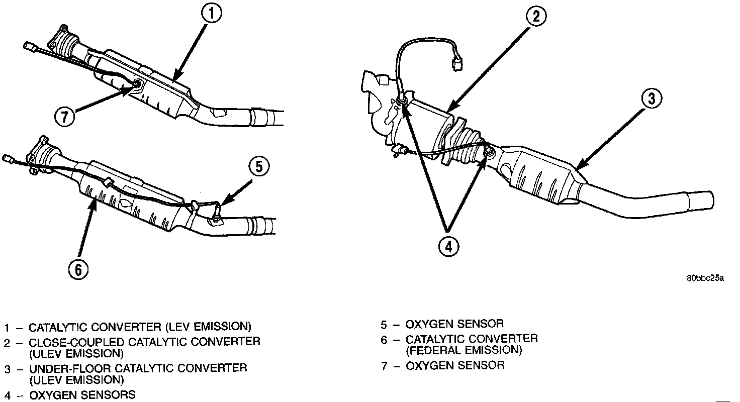 The downstream heated oxygen sensor threads into the system depending on emission package. Federal package the O2s is mounted after the catalytic convertor, ULEV package the O2s is mounted mid catalytic convertor, ULEV package is mounted between the catalytic convertor.