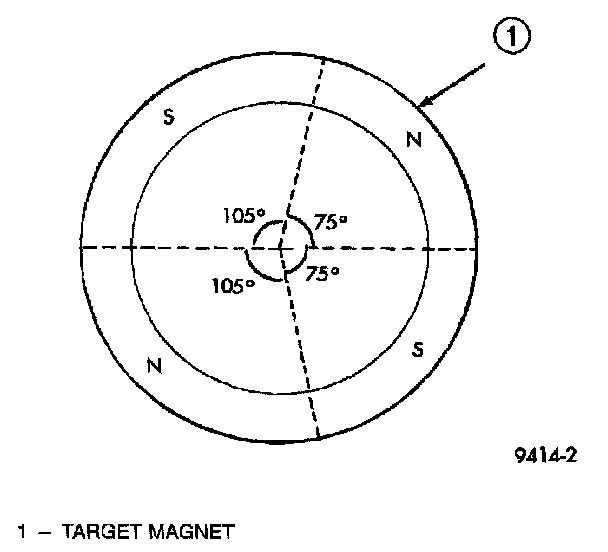 A target magnet attaches to the rear of the camshaft and indexes to the correct position. The target magnet has four different poles arranged in an asymmetrical pattern. As the target magnet rotates, the camshaft position sensor senses the change in polarity. The sensor output switch switches from high (5.0 volts) to low (0.5 volts) as the target magnet rotates. When the north pole of the target magnet passes under the sensor, the output switches high. The sensor output switches low when the south pole of the target magnet passes underneath.