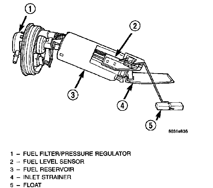 The fuel level sensor (fuel gauge sending unit) is attached to the side of the fuel pump module. The level sensor consists of a float, an arm, and a variable resistor.