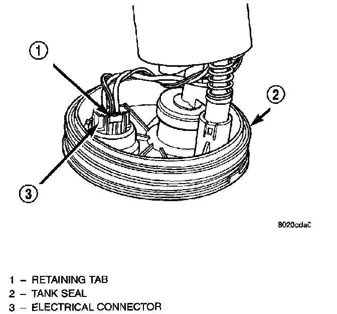 1. Depress retaining tab and remove the fuel pump/level sensor connector from the bottom of the fuel pump module electrical connector.