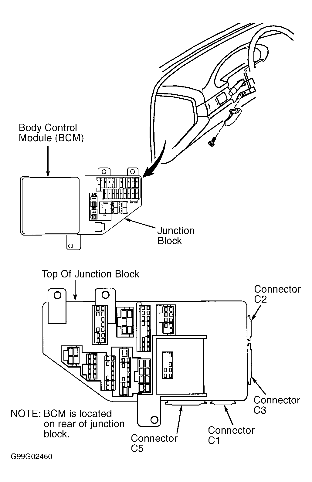 - Ensure ignition is off. Disconnect PCM and BCM connectors. PCM is located at driver's side front corner of engine compartment, just below air cleaner assembly. The BCM is located on rear of junction block at driver's side of instrument panel. See Fig 1 .