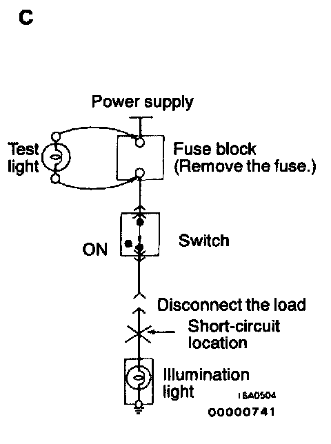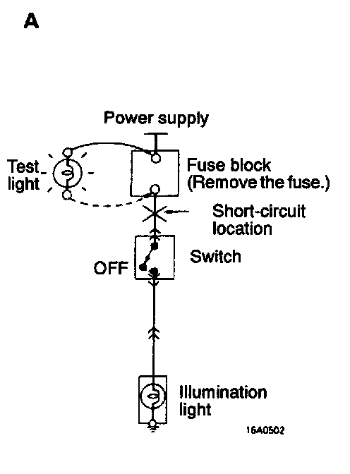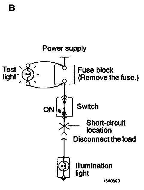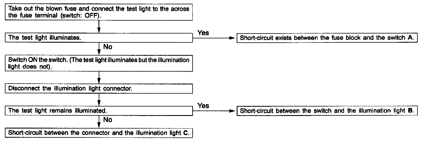 Because the fuse has blown, it is probable that there is a short-circuit. Follow the procedures to narrow down the short-circuit location.