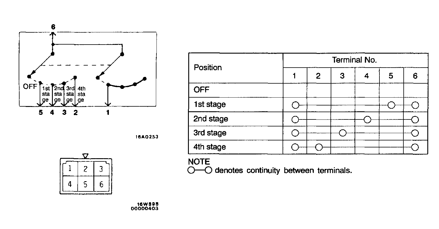 This figure illustrates a complex switch. The continuity between terminals at each position is as indicated in the table below.