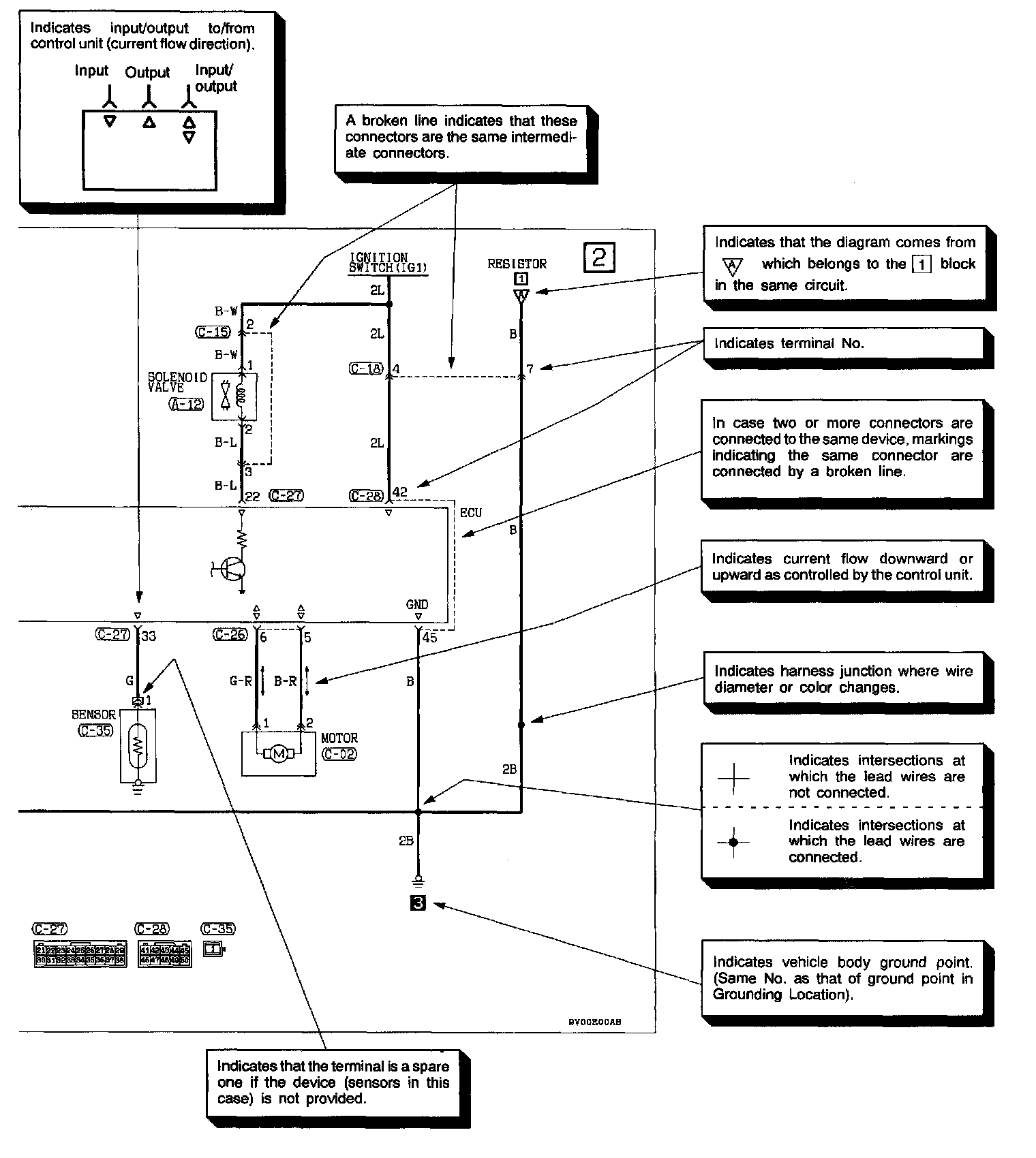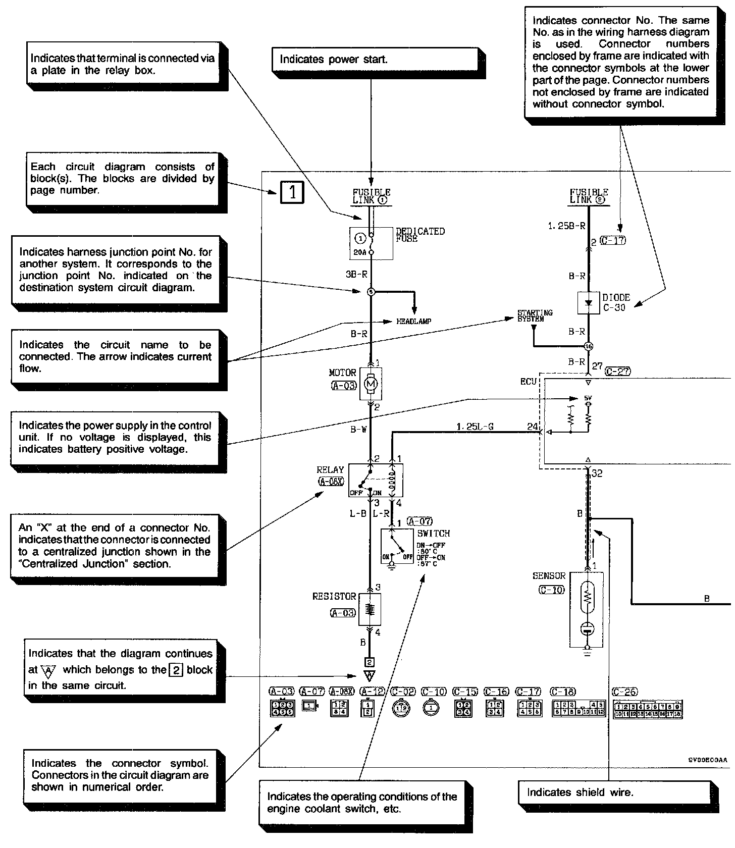 The circuit of each system from the fuse (or fusible link) to ground is shown. The power supply is shown at the top and the ground at the bottom to facilitate understanding of the current flow.