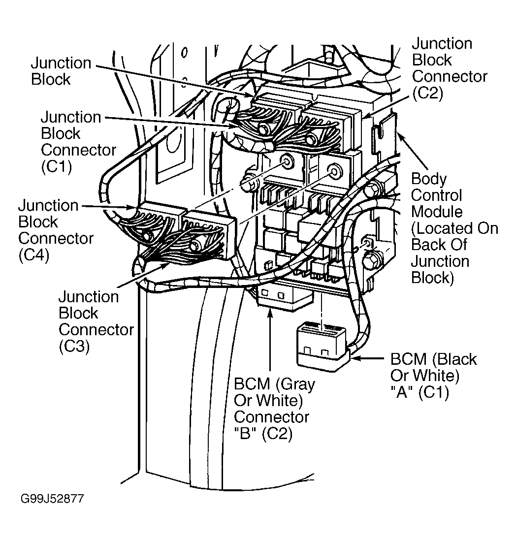 - Disconnect BCM connector "A". BCM is located with junction block under driver's side instrument panel. See Figure . Connect a jumper wire between ground and terminal No. 6 (Light Green/Red wire) at RKE module connector. Using scan tool in ohmmeter mode, measure resistance at terminal No. 4 (Light Green/Red wire) at BCM connector "A". See Figure . If resistance is 5 ohms or more, repair open in Light Green/Red wire between BCM and RKE module. If resistance is less than 5 ohms, go to next step.