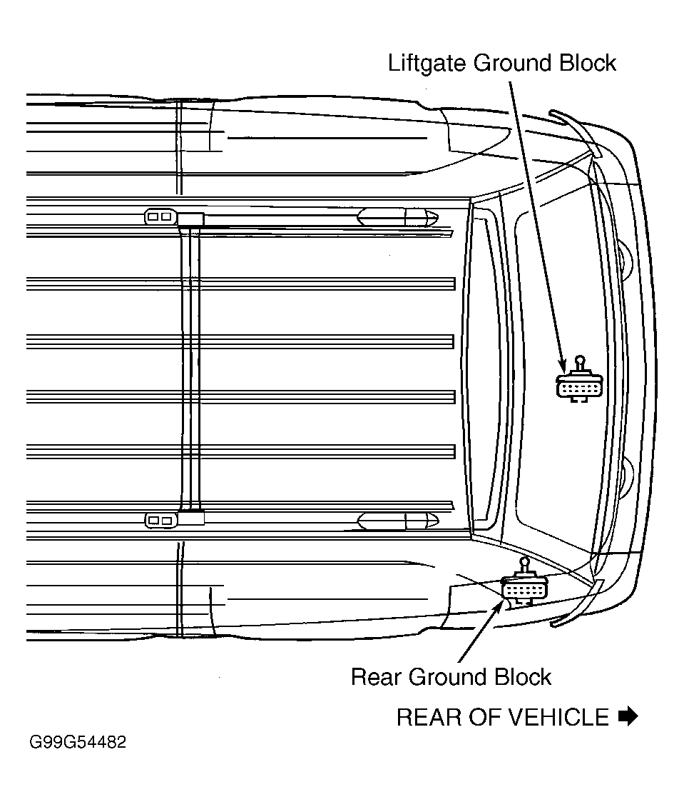 - Turn ignition off. Turn all lights and accessories off. Measure resistance between ground and Black/Light Green wire at liftgate key cylinder switch connector. If resistance is less than 5 ohms, go to next step. If resistance is 5 ohms or more, repair open in Black/Light Green wire between liftgate key cylinder switch and ground. Ground location is located in liftgate. See Figure .
