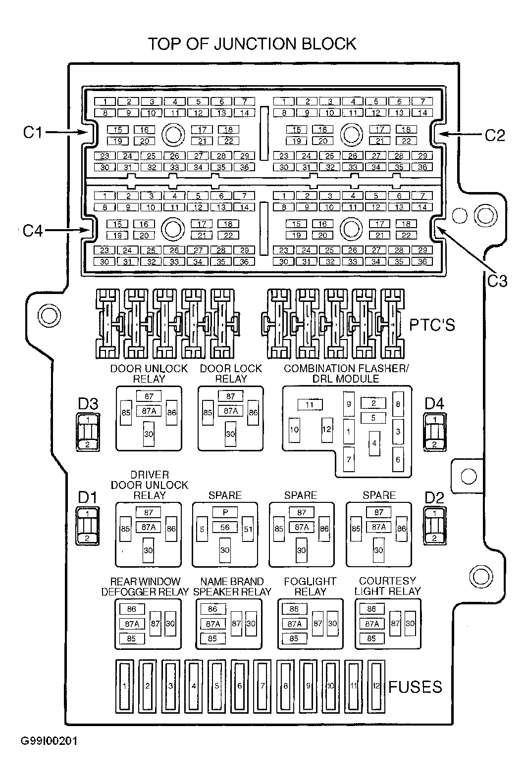 - Install horn relay. Backprobing, connector a jumper wire between ground and terminal No. 4 (Gray/Orange wire) at junction block connector C2. See Figure . If horn sounds, replace BCM. If does not sound, repair open in Gray/Orange wire.