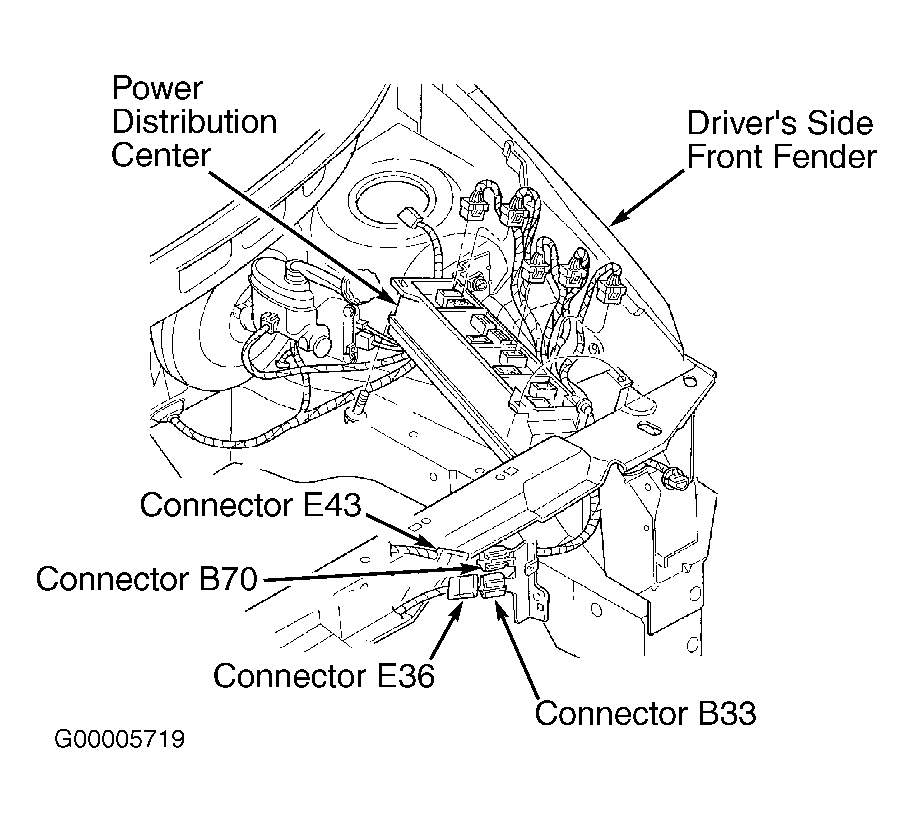 3. On all models, turn ignition on with engine off. On 2.4L, 3.0L late build, 3.3L and 3.8L, using voltmeter, check voltage on downstream oxygen sensor ground circuit by backprobing between terminal No. 3 (Black/Light Blue wire) on wiring harness side of downstream oxygen sensor connector and terminal No. 27 (Black/Orange wire) on Black PCM connector C1. This wire comes from downstream oxygen sensor as Black/Light Blue wire and changes to Black/Orange wire at connectors B33 and E36. Connectors B33 and E36 are located near front of driver's side of frame rail. See Fig 1 . On 3.0L early build, using voltmeter, check voltage on downstream oxygen sensor ground circuit by backprobing between terminal No. 3 (Black/Light Blue wire) on wiring harness side of downstream oxygen sensor connector and terminal No. 43 (Black/Light Blue wire) on Gray PCM connector C2. On all models, PCM is located between driver's side front fender and power distribution center, near battery.
