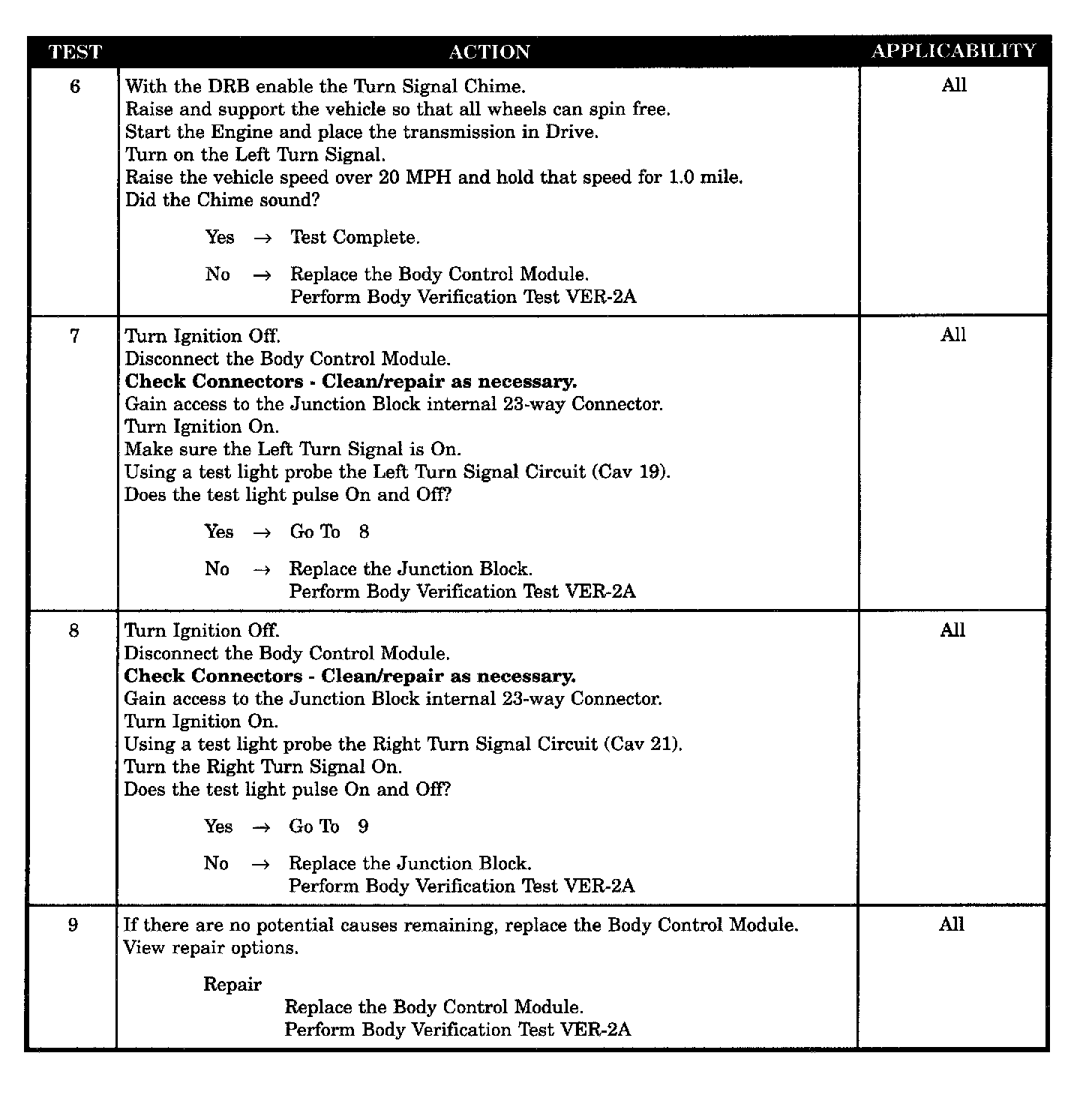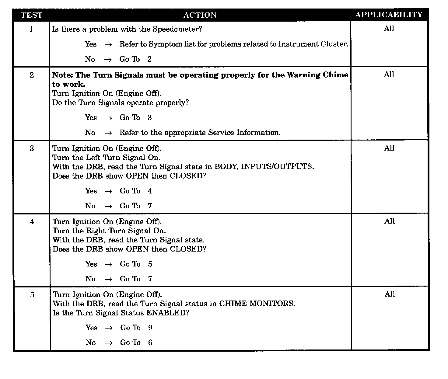 Home >> Chrysler >> 2000 >> Voyager L4-2.4L VIN B >> Repair and Diagnosis >> Powertrain Management >> Computers and Control Systems >> Relays and Modules - Computers and Control Systems >> Body Control Module >> Testing and Inspection >> Symptom Related Diagnostic Procedures >> Chime Inoperative With L or R Turn Signal On For 1 Mile