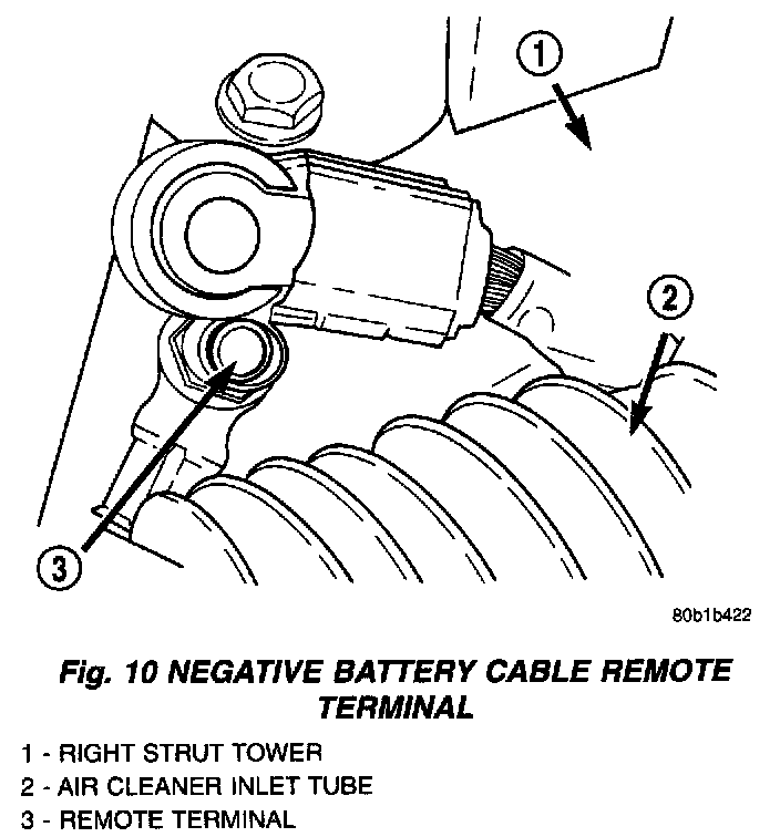 1. Open hood and disconnect the negative battery cable remote terminal from the remote battery post.