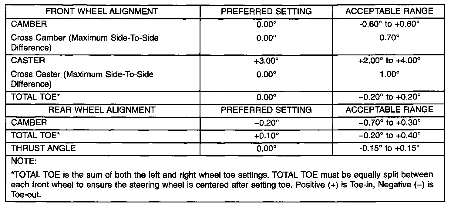 TOTAL TOE* FRONT WHEEL ALIGNMENT 0.00 degrees PREFERRED SETTING -0.20 degrees to +0.20 degrees ACCEPTABLE RANGE