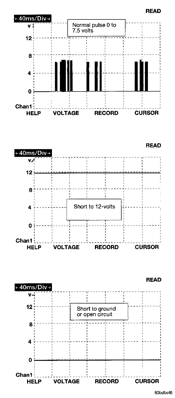Each module provides its own bias and termination in order to transmit and receive messages. The bus voltage is at zero volts when no modules are transmitting and is pulled up to about seven and a half volts when modules are transmitting. The bus messages are transmitted at a rate averaging 10800 bits per second. Since there is only voltage present when the modules transmit, and the message length is only about 500 milliseconds, it is ineffective to try and measure the bus activity with a conventional voltmeter. The preferred method is to use DRBIII(R) lab scope. The 12 V square wave selection on the 20-volt scale provides a good view of the bus activity. Voltage on the bus should pulse between zero and about seven and a half volts. Refer to the following figure for some typical displays.