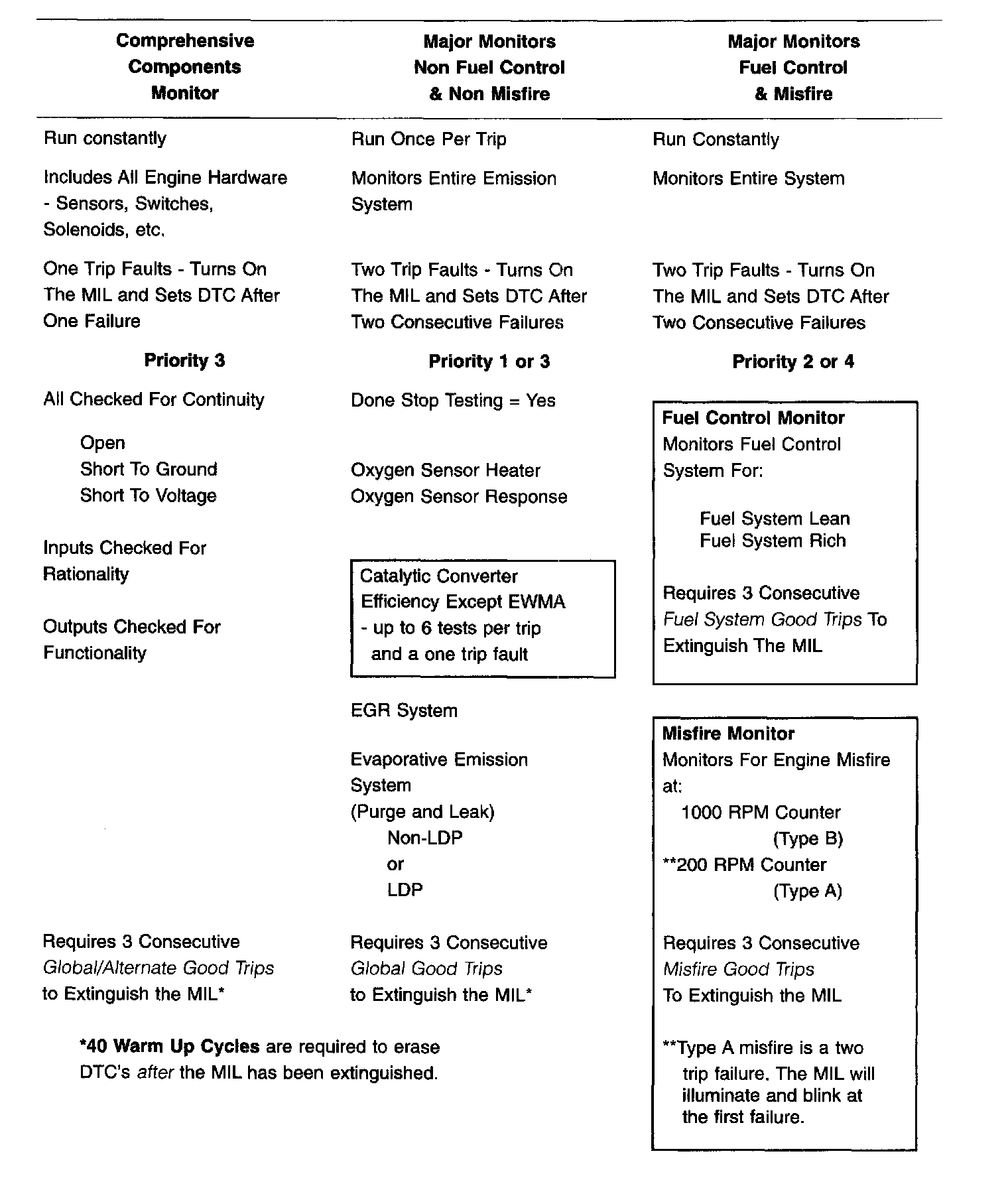 The table summarizes the various OBD II monitors operation.