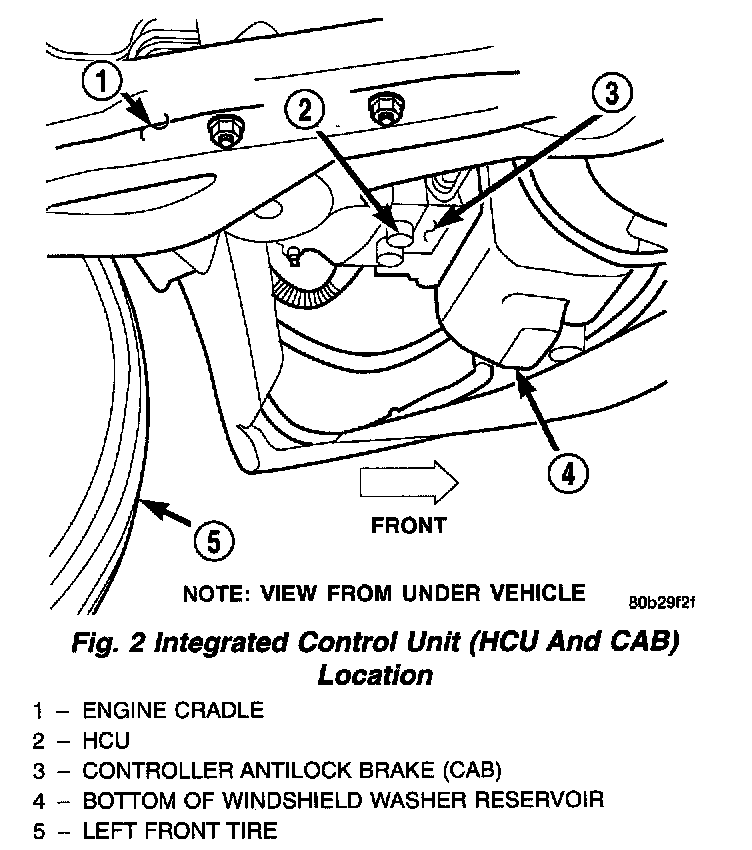 The Hydraulic control unit (HCU) and the Controller Antilock Brake (CAB) used with this antilock brake system are combined (integrated) into one unit, which is called the Integrated Control Unit (ICU). The ICU is located in front of the driver's side front tire, behind the inner fender splash shield.