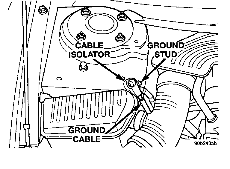 2. Correctly isolate remote ground cable when servicing vehicle by installing the ground cable insulator on the strut tower ground stud as shown in and installing the nut on the stud. This will prevent accidental grounding of the remote ground cable.