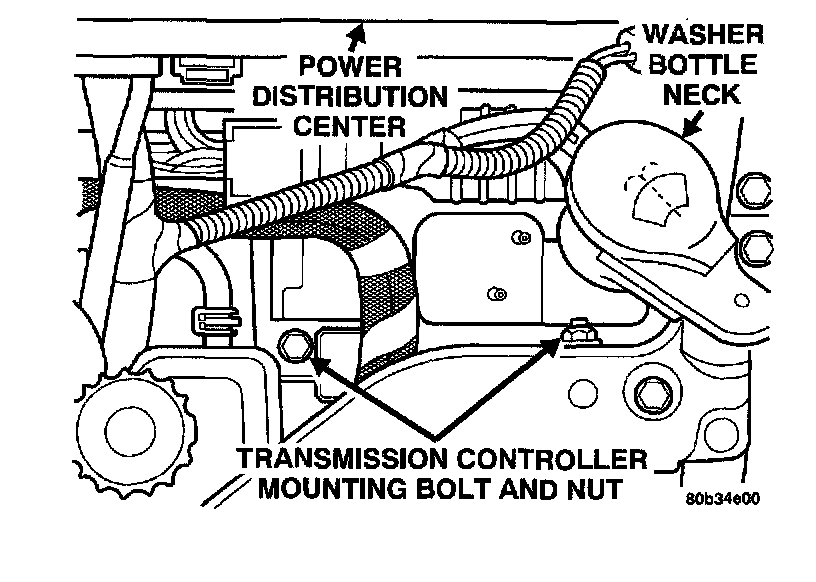 6. Remove the nut and bolt holding the transmission controller and bracket to vehicle. Lift transmission controller up and move away from mounting position.