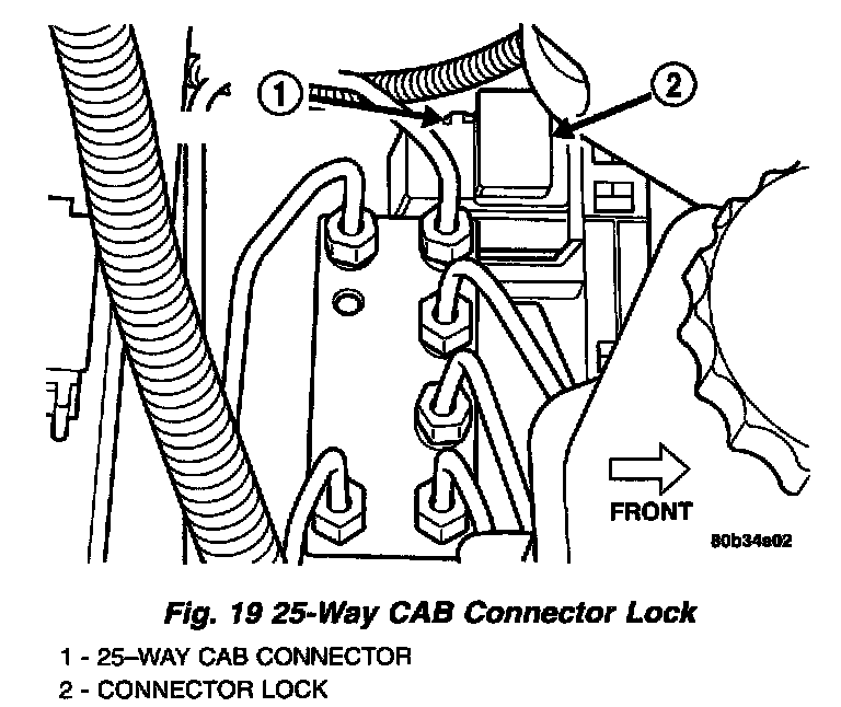 10. Disconnect the 25-way wiring harness connector from the CAB using the following procedure. Grasp the lock on the 25-way connector, and pull it up from the connector as far as possible. This will unlock and raise the 25-way connector out of the socket on the CAB.