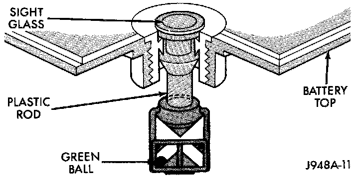 An indicator (hydrometer) built into the top of the battery case provides visual information for battery testing. Like a hydrometer, the built-in indicator measures the specific gravity of the battery electrolyte. The specific gravity of the electrolyte reveals the battery state-of-charge; however, it will not reveal the cranking capacity of the battery. A load test must be performed to determine the battery cranking capacity. Refer to Standard Procedures for the proper battery load test procedures.