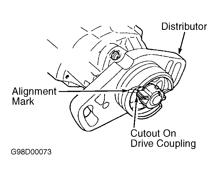 2. Align mating marks on drive coupling and distributor housing. See Fig 1. Install distributor using a NEW "O" ring. Tighten distributor hold-down nuts to specification. See TORQUE SPECIFICATIONS .