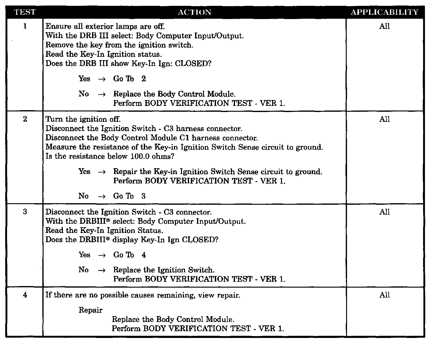 Home >> Chrysler >> 2001 >> Sebring Convertible V6-2.7L VIN U >> Repair and Diagnosis >> Powertrain Management >> Computers and Control Systems >> Relays and Modules - Computers and Control Systems >> Body Control Module >> Testing and Inspection >> Symptom Related Diagnostic Procedures >> Chime Sounds With Drivers Door Open and Key Removed From Ignition