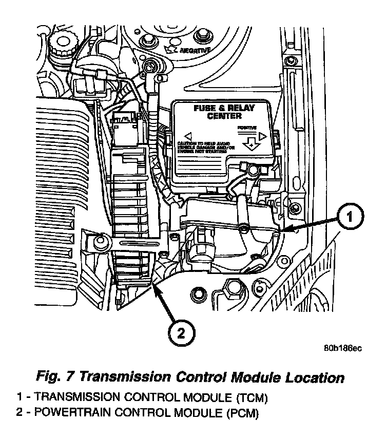 The Transmission Control Module (TCM) is located between the Power Distribution Center (PDC) and the left headlamp assembly, in the left side of the engine compartment (Fig. 7).