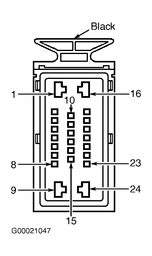 - Turn ignition off. Disconnect CAB connector. CAB is located on left side of engine compartment. See Figure . Measure resistance between ground and terminals No. 1 (Black wire) and No. 16 (Black wire) at CAB harness connector. See Figure . If resistance is 5 ohms or more at any terminal, repair open or high resistance in appropriate Black wire between CAB and ground. If resistance is less than 5 ohms at both terminals, go to next step.