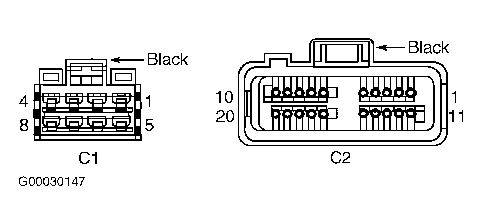 - Turn ignition off. Disconnect Power Liftgate Module (PLGM) connector C1. See Figure . To access connector, left rear trim will need to be removed. See POWER LIFTGATE MODULE under REMOVAL & INSTALLATION. Using a test light connected to battery voltage, probe PLGM connector C1 terminal No. 8 (Black/White wire). See Figure . If test light illuminates brightly, go to next step. If test light does not illuminate or is dim, repair open or high resistance in Black/White wire between PLGM and ground connection located in left rear corner of vehicle.