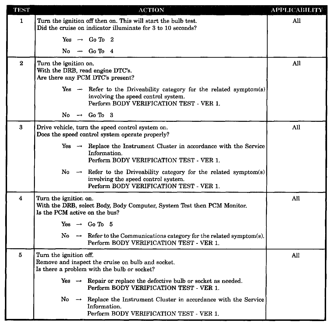 Home >> Chrysler >> 2002 >> Intrepid (CANADA) V6-2.7L >> Repair and Diagnosis >> Powertrain Management >> Computers and Control Systems >> Body Control Module >> Testing and Inspection >> Symptom Related Diagnostic Procedures >> Cruise on Indicator Not Operating Properly