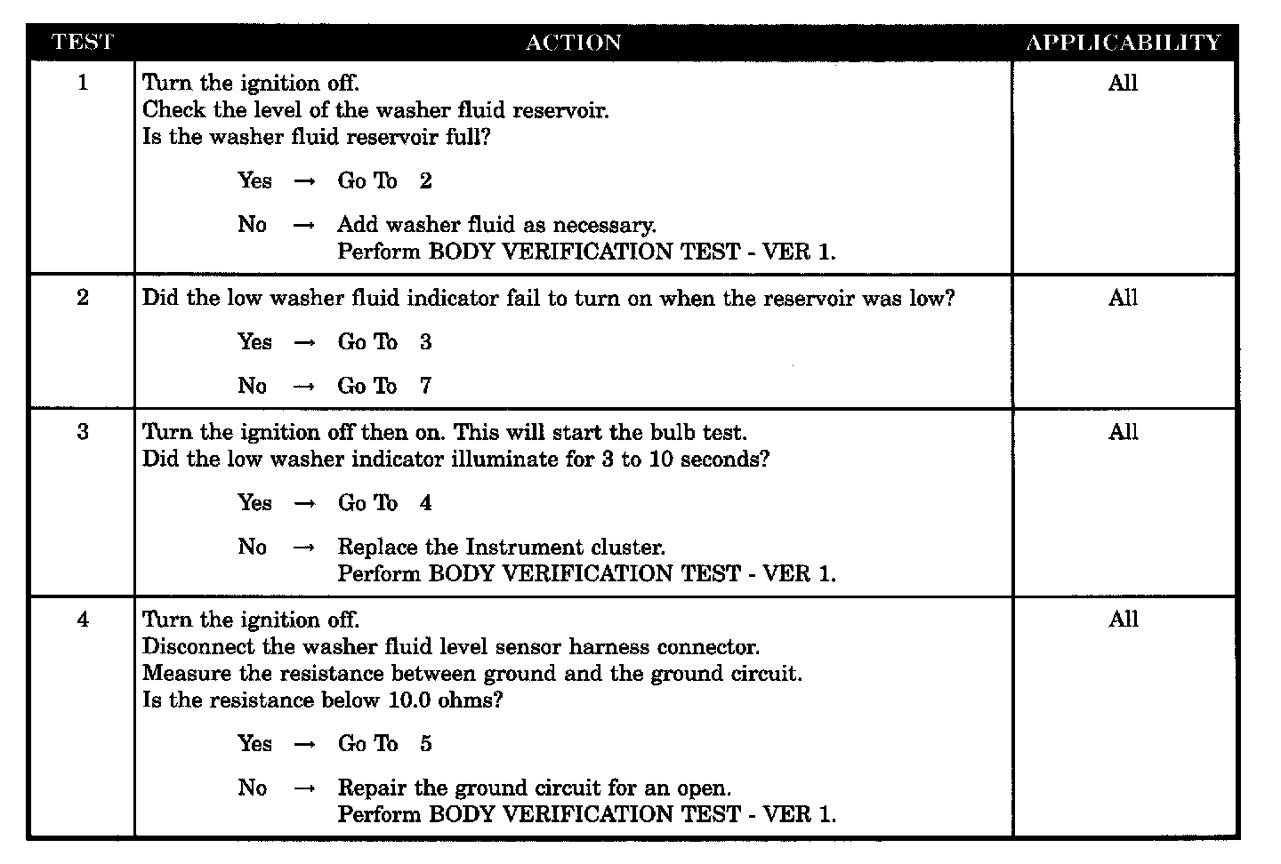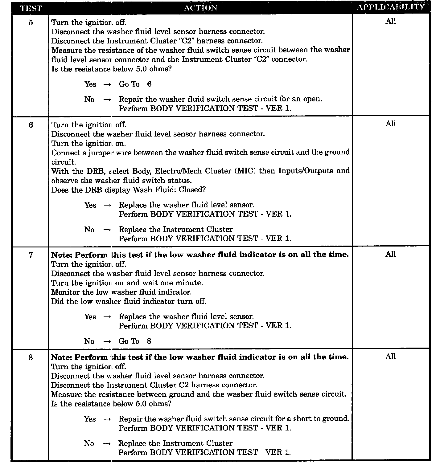 Home >> Chrysler >> 2002 >> Intrepid (CANADA) V6-2.7L >> Repair and Diagnosis >> Powertrain Management >> Computers and Control Systems >> Body Control Module >> Testing and Inspection >> Symptom Related Diagnostic Procedures >> Low Washer Fluid Indicator Not Operating Properly