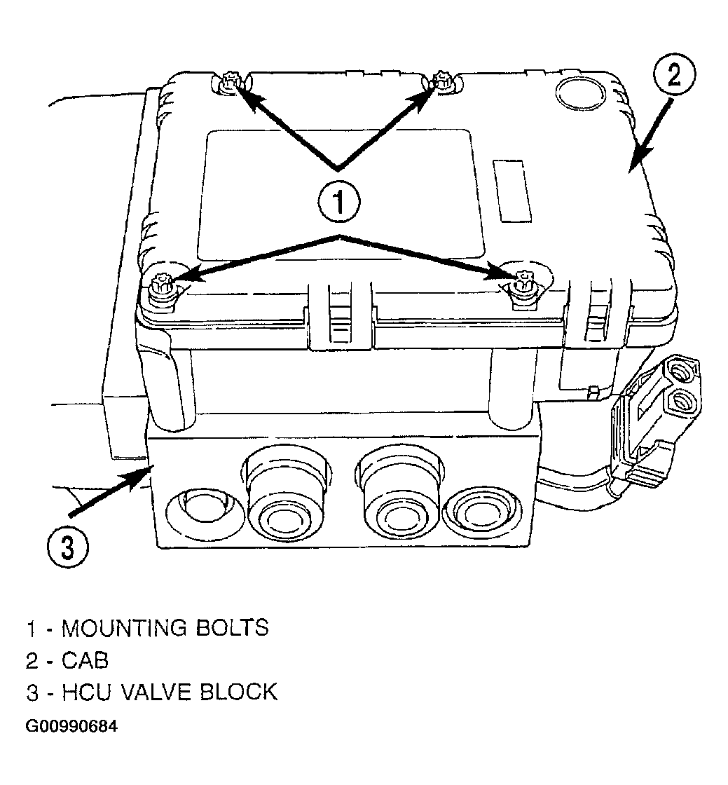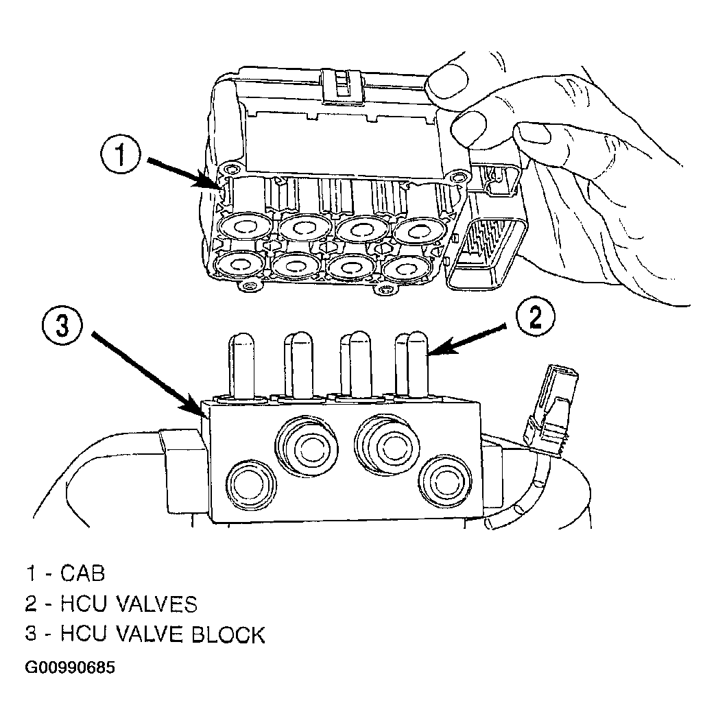 To replace the hydraulic control unit (HCU) or the controller antilock brake (CAB) on this vehicle, the entire integrated control unit (ICU) needs to be removed from the vehicle. The CAB can then be separated from the HCU. Do not attempt to replace the CAB with the ICU mounted in the vehicle.