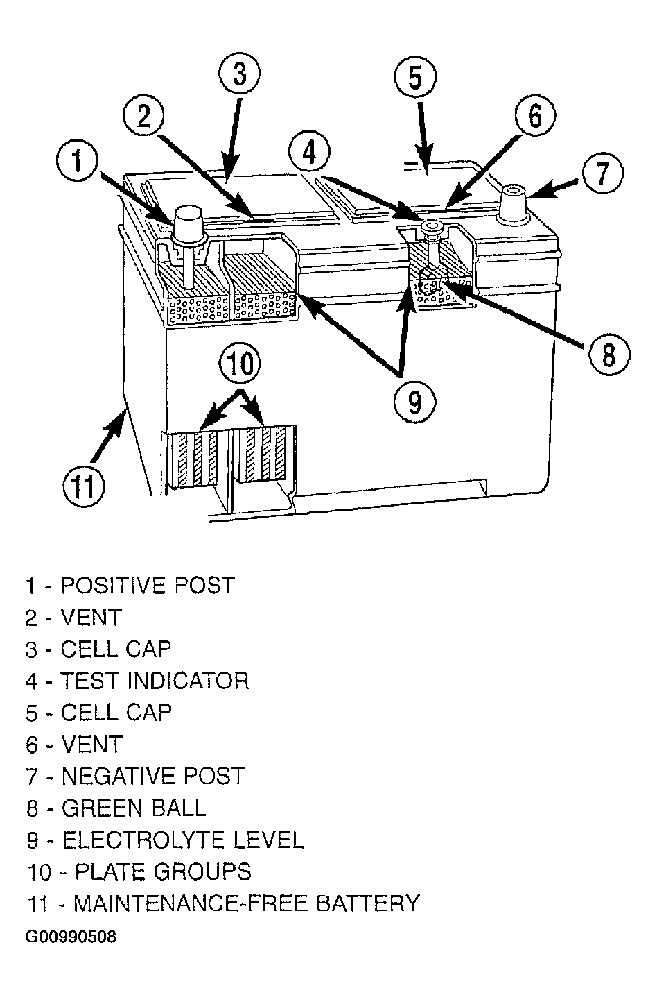 Maintenance-free batteries have non-removable battery vent caps (Fig 1). Water cannot be added to this battery. Under normal service the composition of this battery reduces gassing and water loss at normal charge rates. If the battery electrolyte level becomes low, this battery must be replaced.