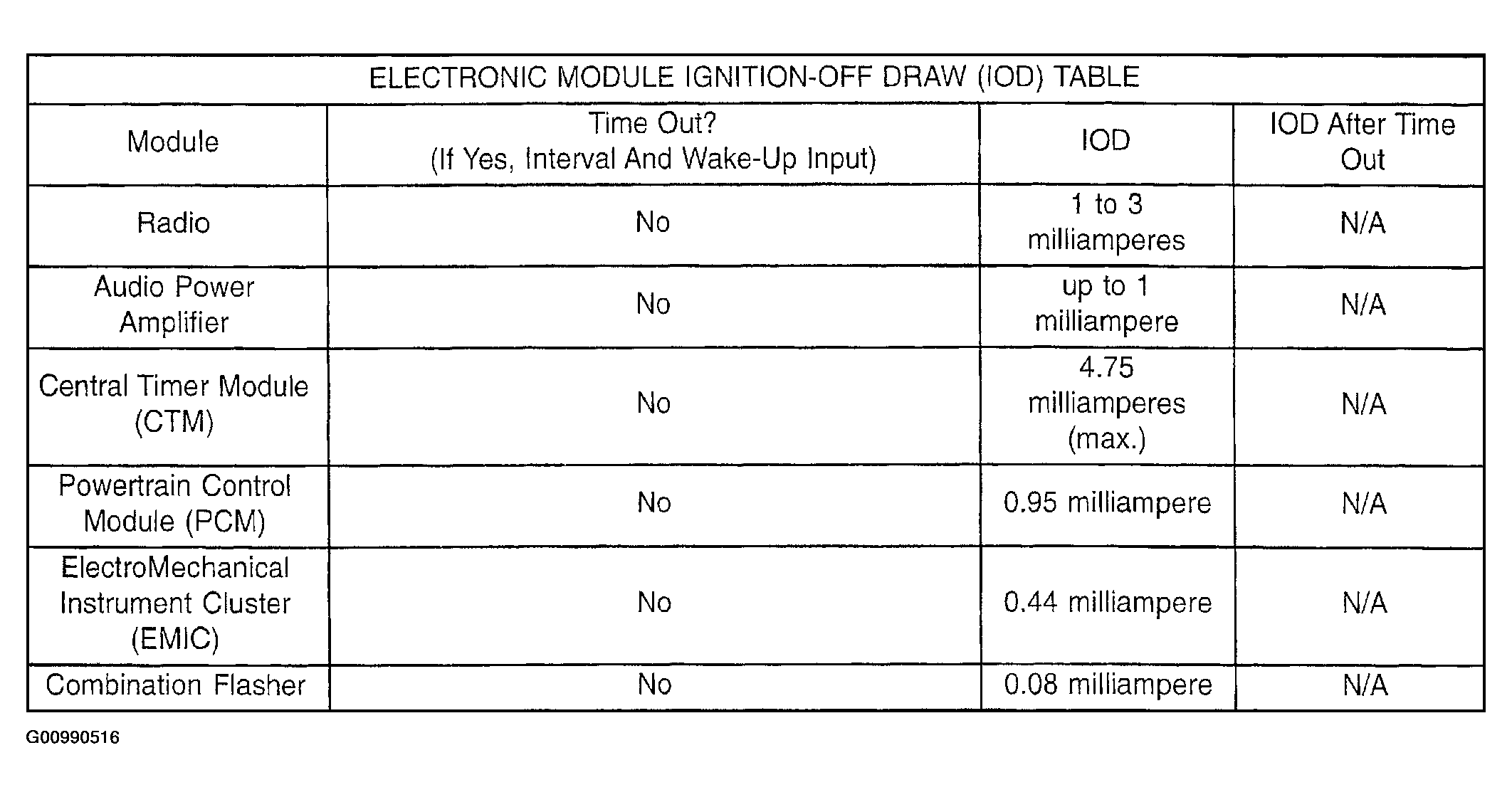 The term Ignition-Off Draw (IOD) identifies a normal condition where power is being drained from the battery with the ignition switch in the Off position. A normal vehicle electrical system will draw from five to thirty-five milliamperes (0.005 to 0.035 ampere) with the ignition switch in the Off position, and all non-ignition controlled circuits in proper working order. Up to thirty-five milliamperes are needed to enable the memory functions for the Powertrain Control Module (PCM), digital clock, electronically tuned radio, and other modules which may vary with the vehicle equipment.