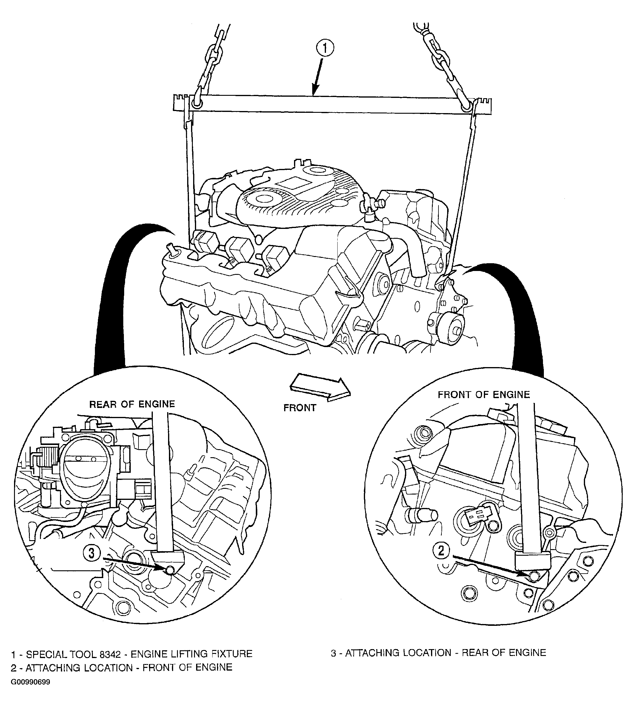 - Attach Special Tool 8342, Engine Lifting Fixture to engine (Figure). Lower engine into engine compartment.CAUTION: Do not tighten the transaxle case to engine block bolts until all bolts have been hand started, and the two mating surfaces are completely joined together, as damage to cylinder block or transaxle could occur.