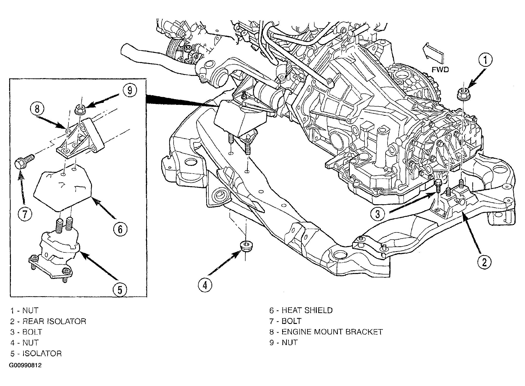 The engine mounting system consist of three mounts; two hydro-type mounts are attached to the right and left side of the engine block, and one molded rubber type rear mount is attached to the transaxle (Fig 1). All three mounts attach to the suspension crossmember/engine cradle.
