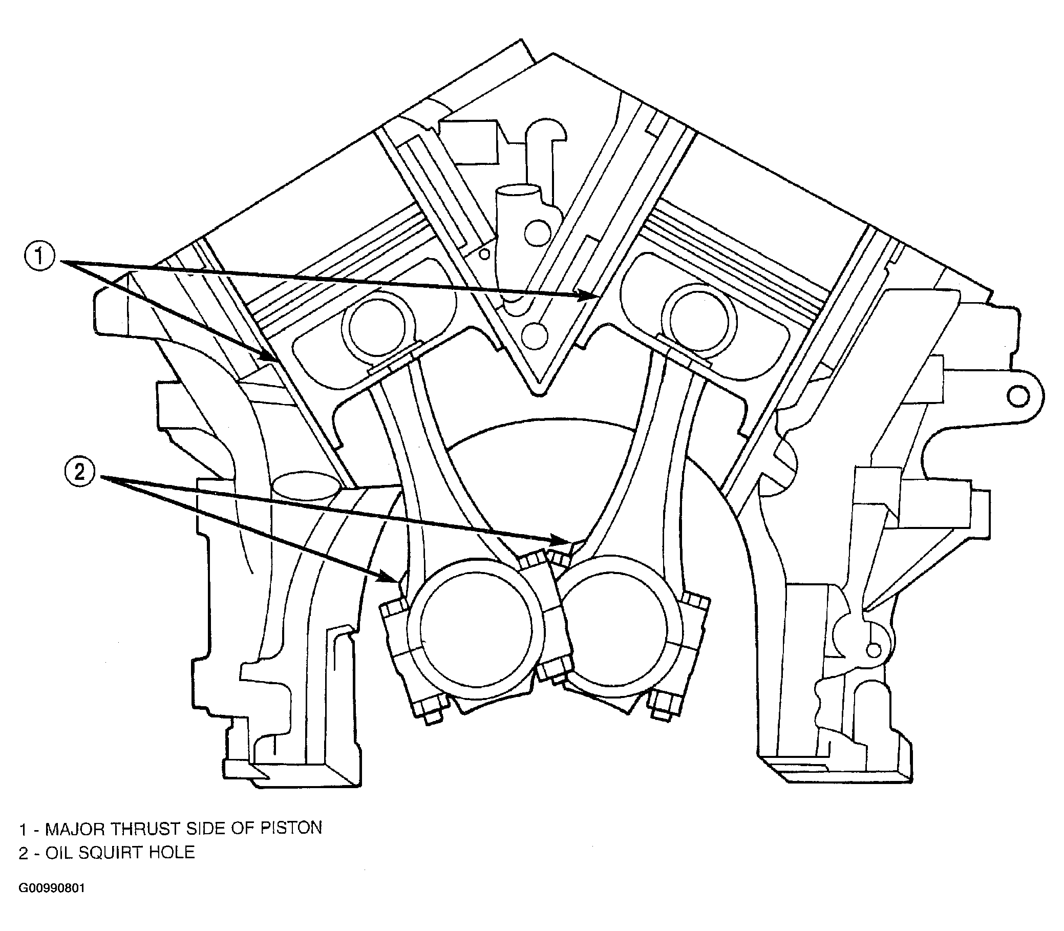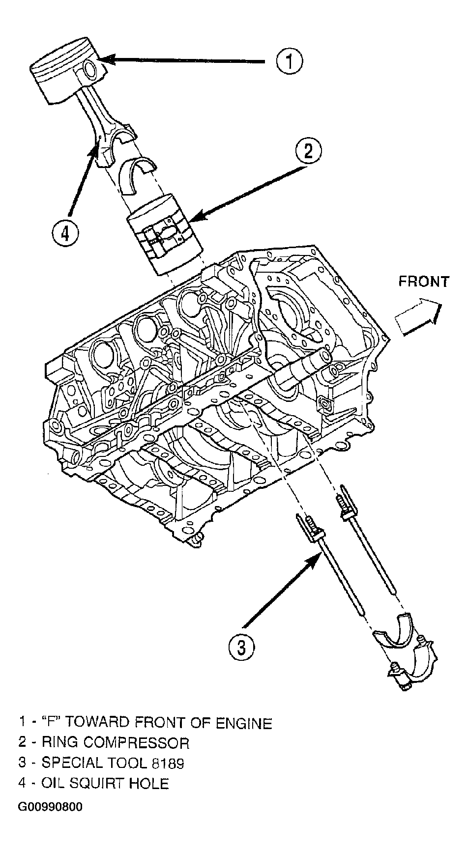 - The pistons are marked on top with an arrow and with an "F" (Front) above the pin boss. These marks must be pointing toward the front of engine on both cylinder banks. The connecting rod oil squirt hole faces the major thrust (right) side of the block (Fig 2).
