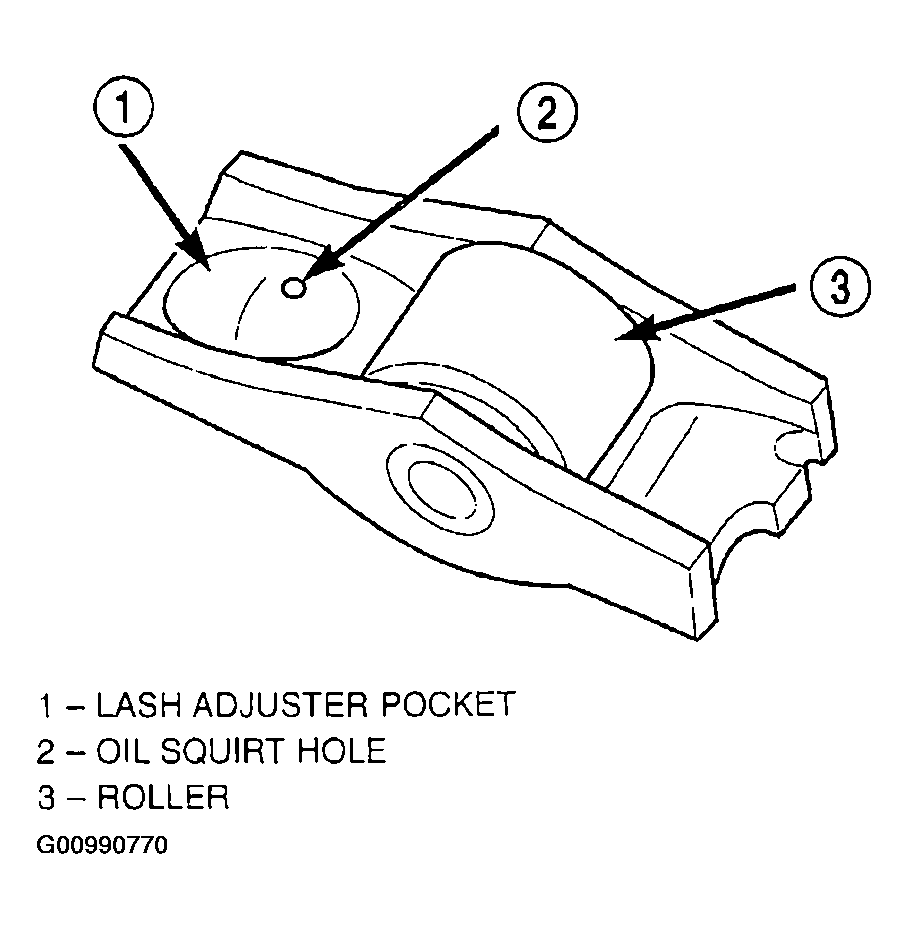 The rocker arms are composed of steel stampings with an integral roller bearing (Fig 1). The rocker arms incorporate a 0.5 mm (0.0197 in.) oil hole in the lash adjuster socket for roller/camshaft lobe lubrication (Fig 1).