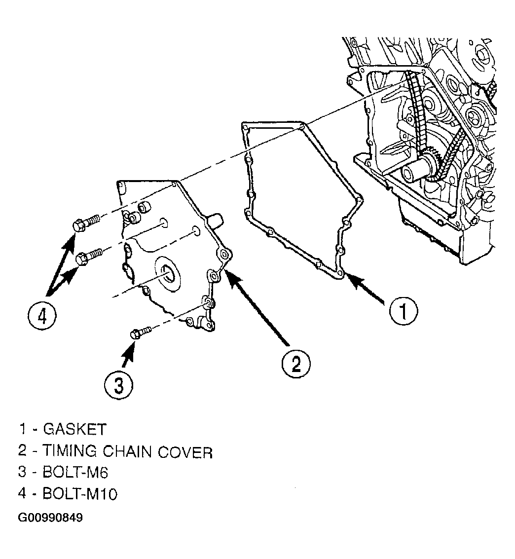 - Install timing cover and gasket. Tighten M10 cover bolts to 54 N.m (40 ft. lbs.) and M6 bolts to 12 N.m (105 in. lbs.) (Figure).