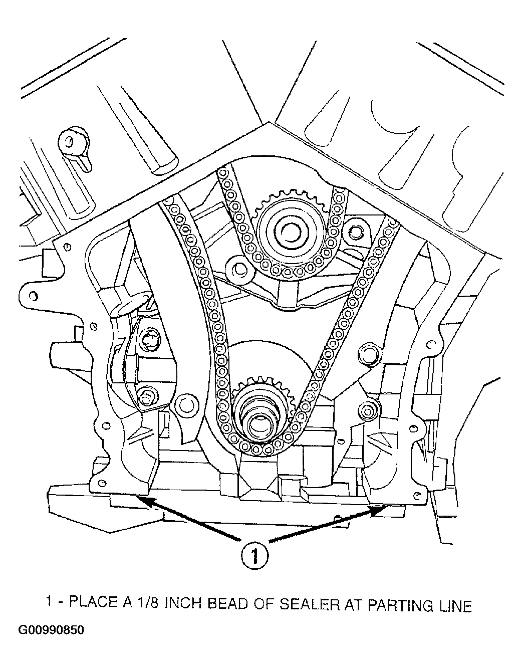 - Before installing timing cover gasket apply a 1/8 inch bead of Mopar® Engine RTV GEN II to the parting lines between the oil pan and cylinder block (Fig 1).