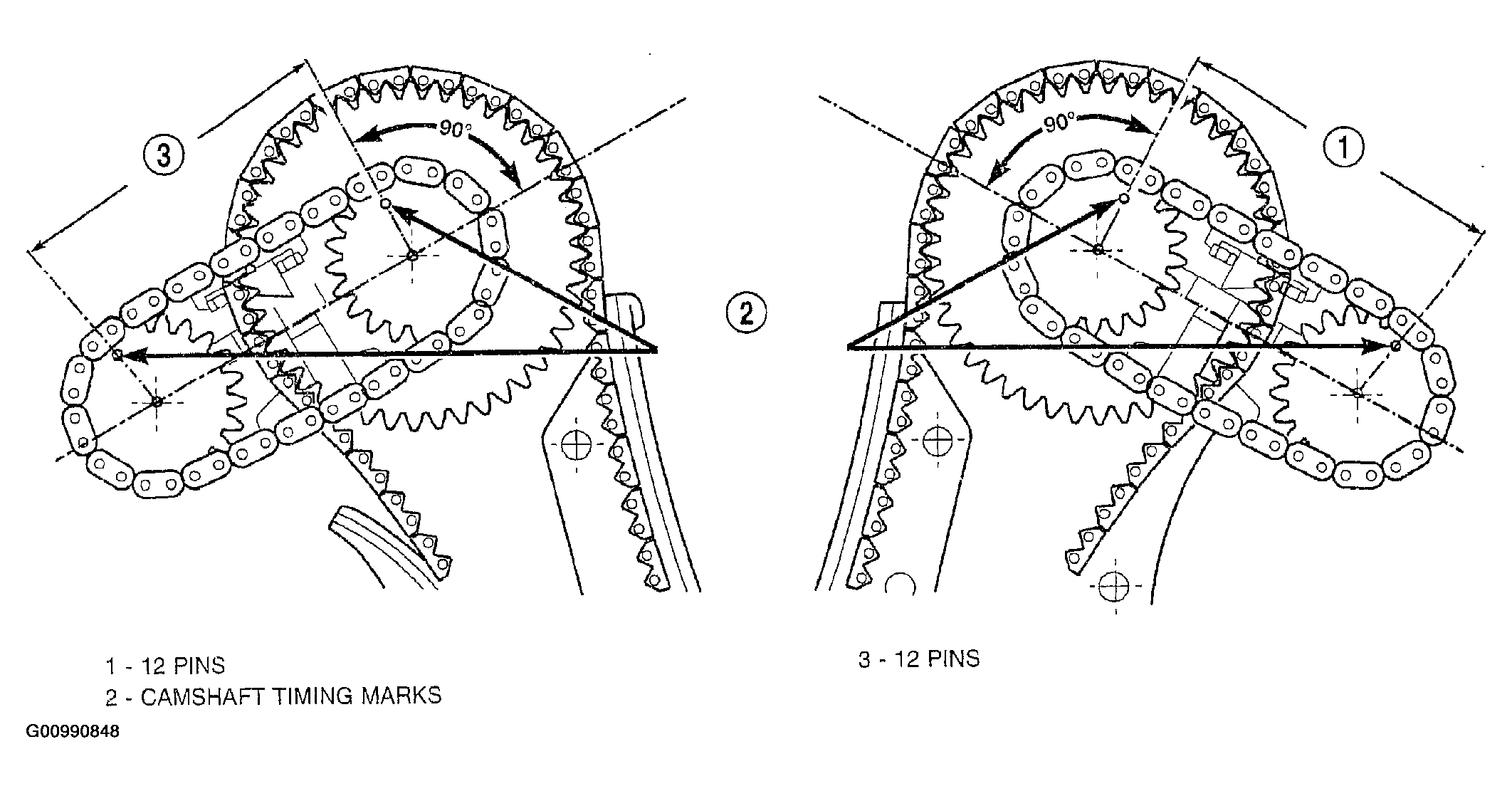 - Count chain pins from the mark on the intake camshaft towards the exhaust camshaft. Engine is timed correctly when there are 12 chain pins between the timing marks on the intake camshaft and exhaust camshaft (Fig 1).