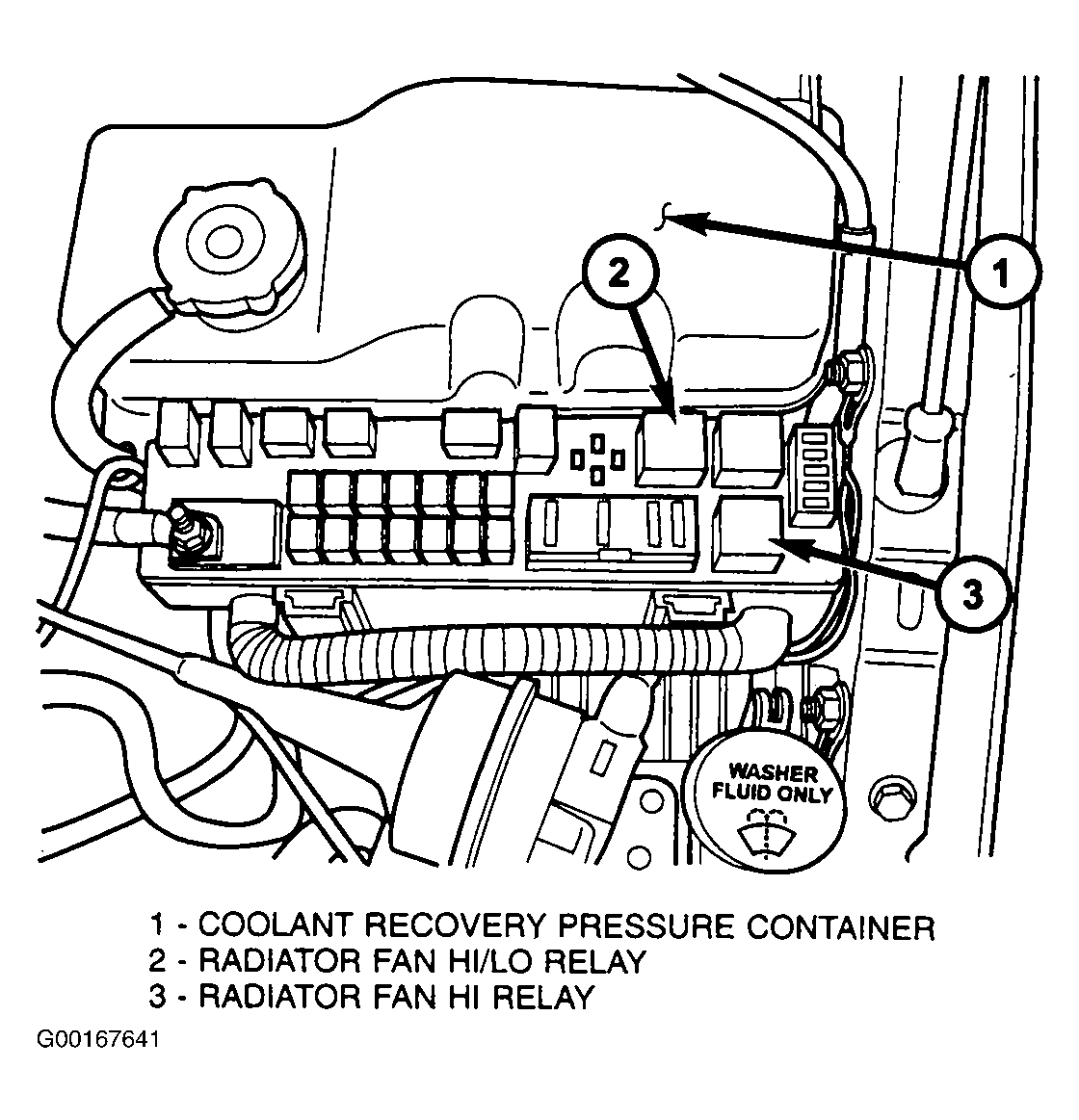 The HI/LO and HI radiator fan relays are located in the Power Distribution Center (PDC) near the coolant recovery pressure container. See Figure . A decal on the inside of the PDC covers shows the location of each relay and fuse contained in the PDC. It is an ISO relay. All vehicles (except 2.7L base) are also equipped with No. 1 and No. 2 radiator fan relays that are mounted to the radiator fan motor shroud. See Figure .