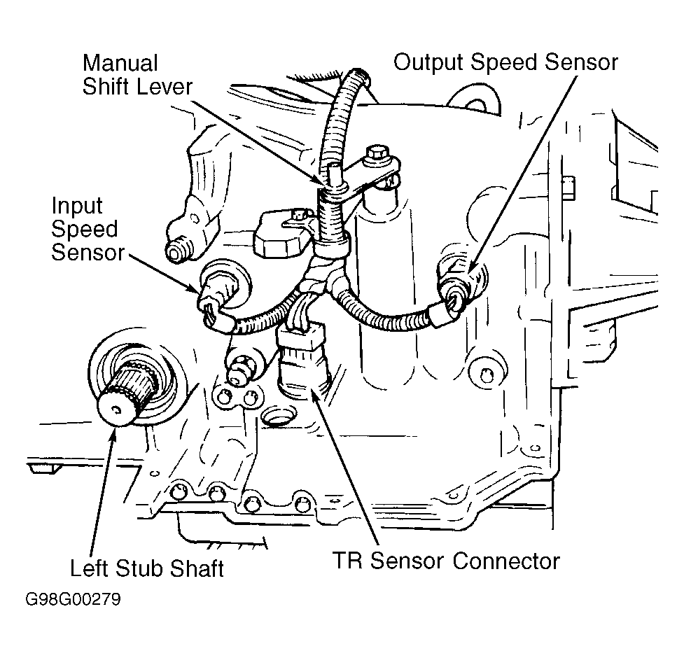 Input speed sensor uses a magnetic pick-up coil to generate an AC voltage input signal when trigger teeth on input clutch assembly pass magnetic pick-up coil. See Figure. PCM uses input signal to determine input shaft speed.