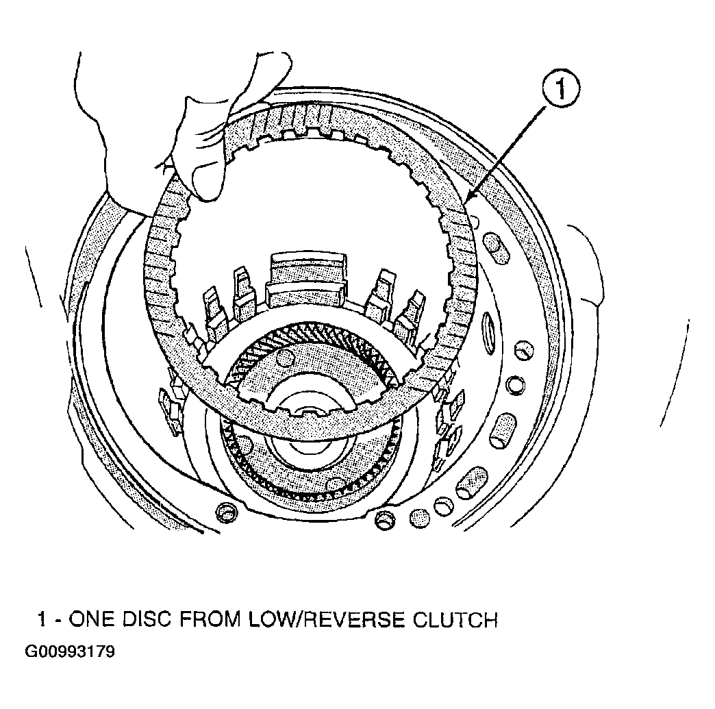 - Remove one (1) low/reverse clutch disc to facilitate snap ring removal. See Fig 35.
