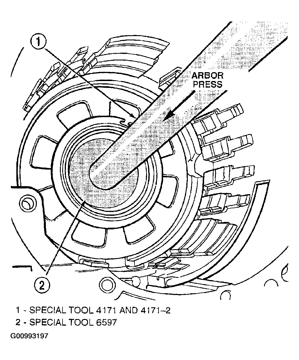 - Install and load Tool 5058 to remove 2/4 clutch retainer snap ring. See Fig 28.