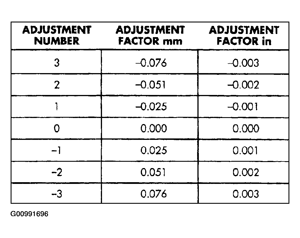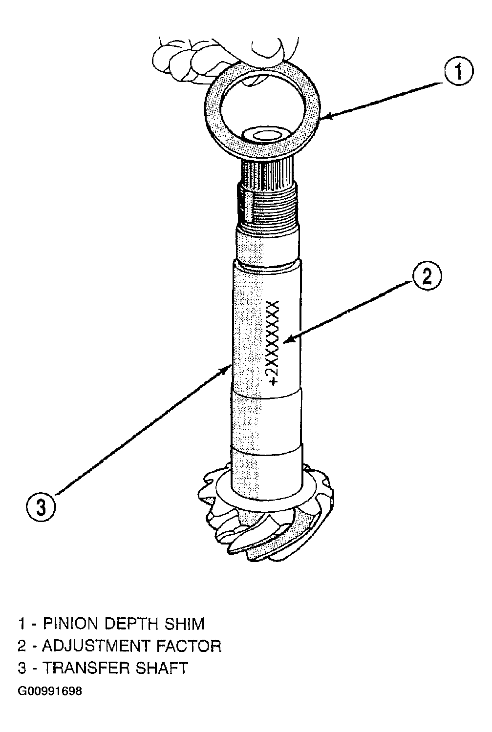 - To determine the required shim thickness, the pinion depth measurement must be adjusted. The pinion shim adjustment number is the first of seven digits ink stamped on the shank of the transfer shaft. See Fig 12. Using the adjustment factor chart in Fig 13, convert the adjustment number to the corresponding adjustment factor. Utilizing the pinion depth measurement obtained in Step 11, add or subtract the adjustment factor to calculate the required shim thickness. Refer to pinion head shim chart for shim selections. This is the shim that will be installed between the transfer shaft pinion head and the front transfer shaft bearing. Refer to the following examples for further explanation: