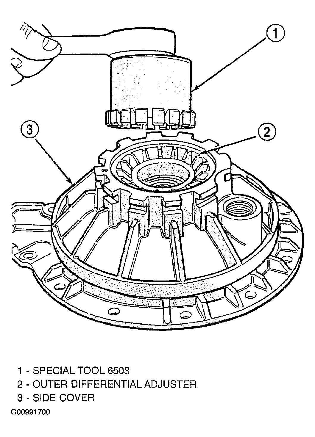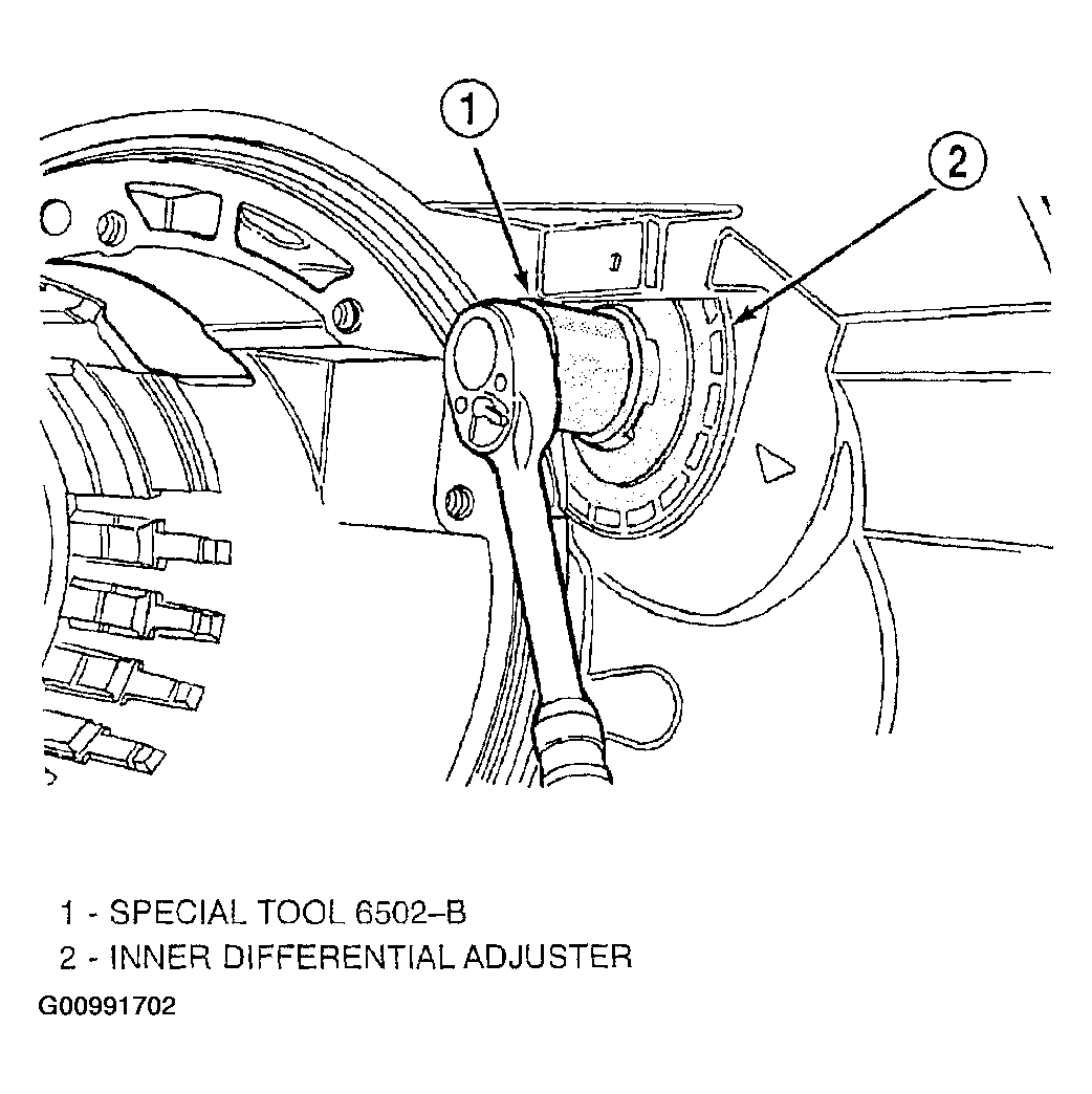 - If there is too much backlash, loosen the outer adjuster with special tool 6503. Then turn the inner adjuster so that it moves away from the ring gear. After adjusting the inner adjuster, retighten the outer adjuster to the torque recorded in Step 30. The inner adjuster should be turned in small increments.