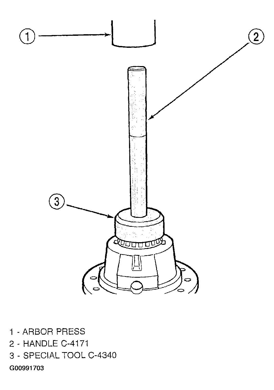 - Install differential carrier bearings using an arbor press, driver handle C-4171, and Tool C-4340. See Fig 19.